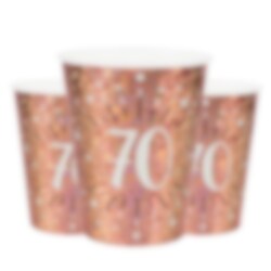 10 kpl tyylikkäitä, ruusukullanvärisiä kimaltavia pahvimukeja jossa on numero "70".