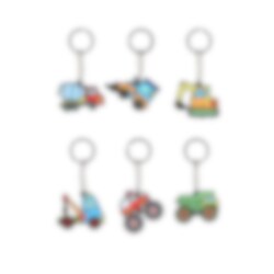 Värikäs avaimenperä erilaisilla työkone-motiiveilla kuten kaivinkone, kuorma-auto ja traktori. Valmistettu pehmeästä kumista mustalla taustalla ja metallirenkaalla, joka tekee kiinnittämisestä helppoa avaimiin, reppuun tai laukkuun. Täydellinen juhlayllätys tai lahja lapsille, jotka rakastavat ajoneuvoja.