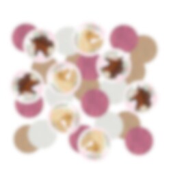 Pakkaus vaaleanpunaisen ja valkoisen värisiä hevosaiheisia paperikonfetteja. Upea koriste ripoteltavaksi pöydälle hevosaiheisiin juhliin.