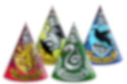 6-pakkaus Harry Potter -juhlahattuja oppilastalojen väreissä. Sopii erinomaisesti Harry Potter -teemaisiin juhliin.