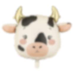 Suloinen lehmän kasvoilmapallo mustine täplineen, vaaleanpunaisine poskipäineen ja kiiltävine kultaisine sarvineen - hauska lisä maatilajuhliin tai safariteemaan.