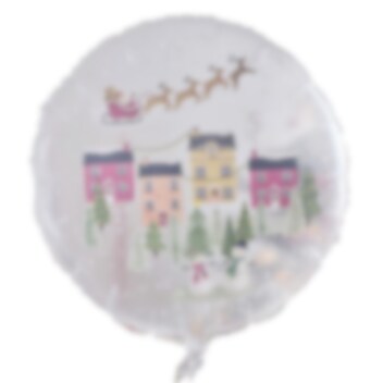 Erittäin hieno läpinäkyvä folioilmapallo, jossa joulupukki lentää viihtyisän joulukylän yllä. Mukana on 5 grammaa valkoista pehmopaperikonfettia, joka luo hauskan lumipalloefektin, 2 metriä läpinäkyvää lankaa ja pilli helppoa ilmantäyttöä varten.