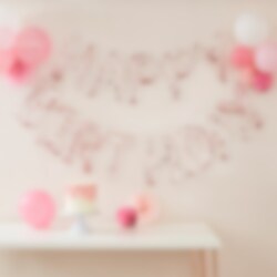 Läpinäkyvä ilmapalloköynnös, joka muodostaa sanan ''Happy Birthday'' ja on täytetty kimaltavalla ruusukultaisella konfetilla. Vaikuttava koriste jokaisiin syntymäpäiväjuhliin. Köynnös on noin 4 m pitkä. Pakkaus sisältää pillin, jonka avulla voit puhaltaa ilmapallot täyteen.