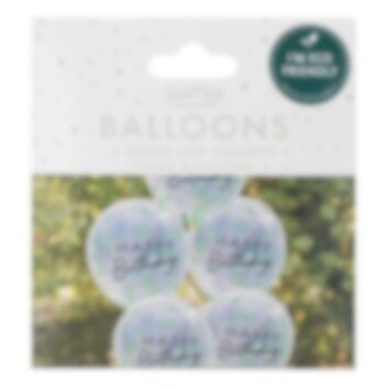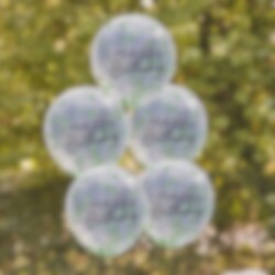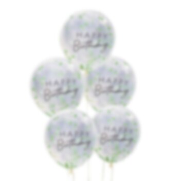 5 kpl läpinäkyviä ilmapalloja jossa on teksti Happy Birthday. Ilmapallojen täytteenä on vihreitä lehtiä esittävää konfettia. Ilmapallojen halkaisija on noin 30 cm täytettynä.