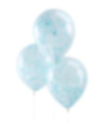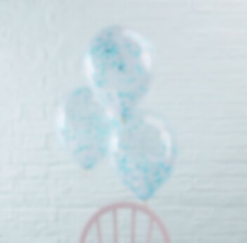 5 kpl läpinäkyviä ilmapalloja, jotka on täytetty sinisillä konfeteilla. Todella kaunis koriste syntymäpäiville tai vauvakutsuille. Ilmapallot voidaan täyttää ilmalla tai heliumilla ja ne ovat täyteenpuhallettuina halkaisijaltaan n. 30 cm.