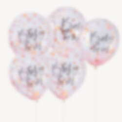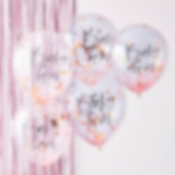 5 kpl ilmapalloja, jotka on täytetty ruusukultaisilla ja roosan värisillä konfeteilla, sekä "Baby Girl" tekstillä pallon pinnassa. Ihana koriste Babyshower-juhliin. Ilmapallojen halkaisija on täytettynä noin 25 cm.