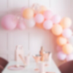 Ilmapalloköynnös vaaleanpunaisen ja aprikoosin väreissä, jonka voit koota itse. Kaunis koriste, joka sopii syntymäpäiville, juhliin ja häihin. Ilmapalloköynnös on kooltaan noin 5 m.