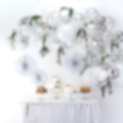 Elegantti hopean ja valkoisen värinen Ilmapallokaari, jonka voit itse rakentaa. Luksus koriste joka sopii monenlaisiin juhliin ja häihin. Pakkaus sisältää 70 kpl ilmapalloja ja englanninkieliset ohjeet ilmapallokaaren rakentamiseen. Ilmapallokaari on rakennettuna noin 4 metrin kokoinen.