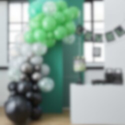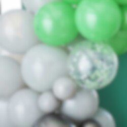 Hieno DIY Ilmapallokaari, jossa on mustan, vihreän ja harmaan värisiä ilmapalloja. Tyylikäs koriste kaikenlaisiin juhliin. Pakkaus sisältää 70 kpl erikokoisia ilmapalloja ja lisävarusteita. Ilmapallokaari on noin 5 metriä pitkä.