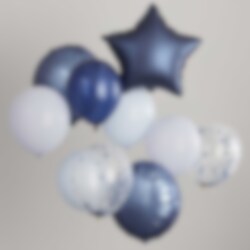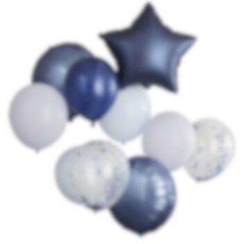 Upea ilmapallokimppu hienoissa tumman- ja vaaleansinisen sävyissä. Kaunis koriste moneen eri tilaisuuteen ja juhlaan, kuten esimerkiksi vauvakutsuille.