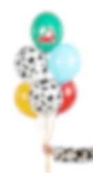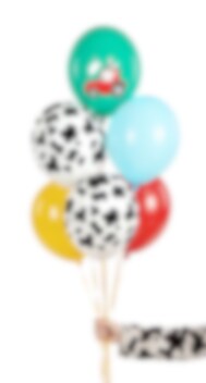 Laadukas ilmapallosetti kauniissa väreissä maatilateemalla. Kiva koriste maatilateemaisiin juhliin. Pakkaus sisältää 2 valkoista ilmapalloa mustilla lehmänlaikuilla, 1 keltaisen ilmapallon, 1 punaisen ilmapallon, 1 vaaleansinisen ilmapallon ja 1 turkoosin ilmapallon, jossa on punainen traktorikuvio. Kaikkien ilmapallojen halkaisija on noin 30 cm täytettynä ja ne voidaan täyttää ilmalla tai heliumilla.