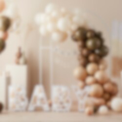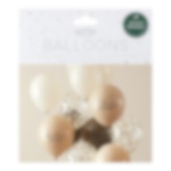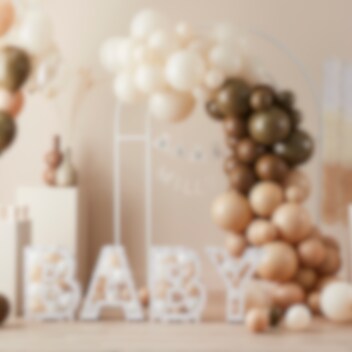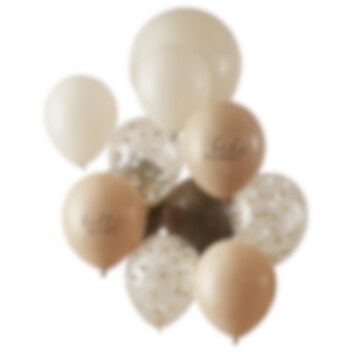 Upea ilmapallokimppu kauniissa neutraaleissa ruskean ja beigen sävyissä. Ne sopivat täydellisesti yhteen Hello Baby- ja Teddy Bear Babyshower -teemojen tuotteiden kanssa.