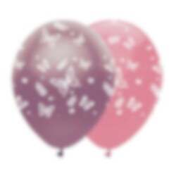6 kpl vaaleanpunaisia ja violetteja lateksi-ilmapalloja, joissa on suloisia valkoisia perhosia. Täydellinen koriste jokaiseen juhlaan. Ilmapallot ovat täytettynä halkaisijaltaan 30 cm ja ne voidaan täyttää ilmapallopumpulla tai heliumilla.