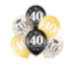 Juhli 40-vuotissyntymäpäivääsi tyylillä! Tämä ilmapallosetti sisältää kaksi mustaa, kaksi kultaväristä ja kaksi läpinäkyvää ilmapalloa konfetilla, kaikki kauniilla 40-painatuksella.