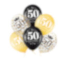 Juhli 50-vuotissyntymäpäivääsi tyylillä! Tämä ilmapallosetti sisältää kaksi mustaa, kaksi kultaväristä ja kaksi läpinäkyvää ilmapalloa konfetilla, kaikki kauniilla 50-painatuksella.