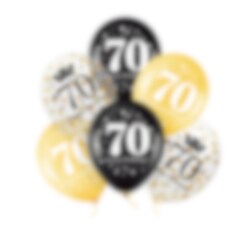 Juhli 70-vuotissyntymäpäivääsi tyylillä! Tämä ilmapallosetti sisältää kaksi mustaa, kaksi kultaväristä ja kaksi läpinäkyvää ilmapalloa konfetilla, kaikki kauniilla 70-painatuksella.