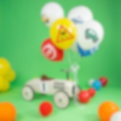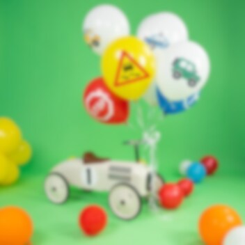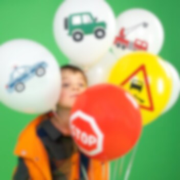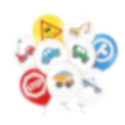 9 kpl. värikkäitä lateksipalloja, joissa on erilaisia ajoneuvoja ja liikennemerkkejä. Ne ovat täydellisiä koristeluun ajoneuvoteemaisiin juhliin. Ilmapallot ovat halkaisijaltaan noin 30 cm täytettynä ja ne voidaan täyttää ilmalla tai heliumilla.