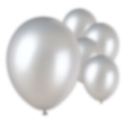 10 kpl upeita, hopeaan vivahtavia metallin värisiä ilmapalloja. Ilmapalloissa on kaunis kiilto, ja ne sopivat koristeiksi ja yhdistettäviksi muihin väreihin ilmapallokimpuissa. Halkaisija n. 30 cm.