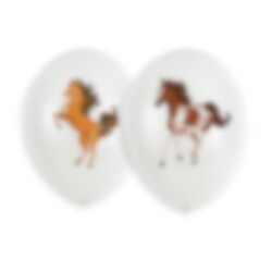 6 kpl valkoisia lateksipalloja hienoilla hevosaiheisilla kuvilla. Upea koriste hevosaiheisiin juhliin. Ilmapallojen halkaisija on täytettynä 27,5 cm. Pallot voi täyttää ilmalla tai heliumilla. Suosittelemme ilmapallopumpun käyttöä.