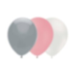 15kpl lateksi-ilmapalloja. Paketissa on harmaan, vaaleanpunaisen ja valkoisen värisiä ilmapalloja, kutakin 5kpl. Ilmapallojen halkaisija on täytettynä noin 28 cm. Pallot voi täyttää tavallisella ilmalla tai heliumilla.