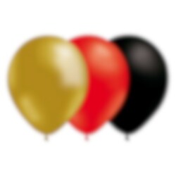 15 lateksi-ilmapalloa väreissä kulta, punainen ja musta, jokaista väriä on 5 kpl. Ilmapallojen halkaisija on noin 28 cm puhallettuna, ja ne voidaan täyttää tavallisella ilmalla tai heliumilla. Vinkki! Käytä ilmapallopumppua, jos haluat täyttää ne tavallisella ilmalla.