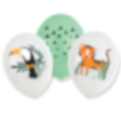 6 lateksi-ilmapalloa väreissä valkoinen ja vihreä. Ilmapalloissa on söpöjä viidakon eläinten kuvia. Täydelliset safari-teemaisiin juhliin. Ilmapallot ovat täytettynä halkaisijaltaan noin 27 cm ja ne voidaan täyttää ilmalla tai heliumilla.