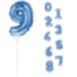 Sininen pieni folioilmapallo koristeeksi kakkuun tai muihin leipomuksiin, tai muuna tyylikkäänä juhlakoristeena. Pallo on n. 13 cm ja tikun päässä. Pallo täyttyy itsestään. Yhdistä haluamasi numerot, 0-9. Hinta viittaa yhteen palloon.