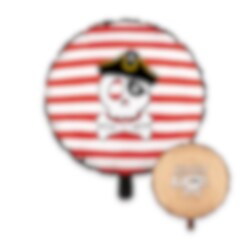 Tämä upea merirosvoteemainen folioilmapallo tuo leikkisän ja juhlavan yksityiskohdan synttärijuhliin. Ilmapallon toisella puolella on kuvitus, jossa on pääkallo, merirosvohattu ja punavalkoisia raitoja, kun taas toista puolta koristaa teksti "Hip Hip Ahoy!" taustalla, joka muistuttaa vanhaa aarrekarttaa.