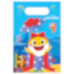8kpl vaaleansinisiä juhlapusseja, joissa on keltainen Baby Shark -hai. Täytä pussit karkilla ja leluilla ja anna ystäville juhlien aikana. Pussien koko on noin 23x16 cm.