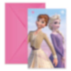 6 kpl hienoja kutsukortteja jossa aiheena on Frozen 2 -elokuvasta tutut Elsa ja Anna. Täydelliset kutsukortit jotka voit lähettää juhlavieraille kun olet kutsumassa heidät Frozen-teemajuhliin.