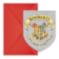 6 kutsukorttia, joissa on Harry Potterista tutun Tylypahkan tunnus. Käytä näitä ja kutsu ystäväsi taianomaisen hauskoihin Harry Potter -juhliin. Kutsukorttien koko on noin 9 x 11,5 cm ja kaikki teksti on englanniksi. Pakkaus sisältää myös 6 punaista kirjekuorta.