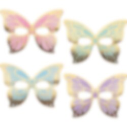 8 kpl perhosia esittäviä naamareita neljässä erilaisessa pastellivärissä kultafolilla. Ne sopivat täydellisesti perhosteemaisiin juhliin. Naamarit asetetaan paikoilleen kuminauhalla.