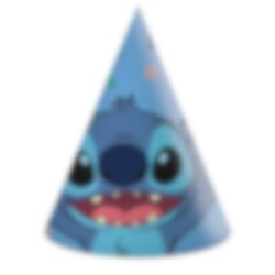 6 kpl. sinisiä pahvisia juhlahattuja hauskoilla kuvioilla Disneyn Lilo & Stitch -elokuvasta. Hatut ovat noin 19 cm korkeita ja ne pysyvät paikoillaan kuminauhan avulla.