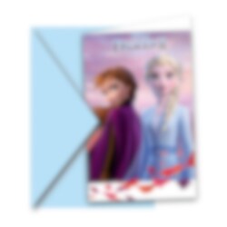 6 kpl kutsukortteja kauniilla värikkäällä teemalla Anna ja Elsa siskoksista Disneyn suositusta Frozen 2 elokuvasta. Käytä näitä kutsuaksesi ystäviä unohtumattomille synttäreille Frozen-teemalla. Kortit ovat noin 14 x 18 xm kokoisia ja pakkaus sisältää lisäksi 6 kpl vaaleansinisiä kirjekuoria. Kaikki tekstit ovat englanniksi.