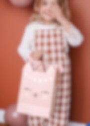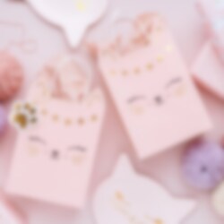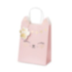 Vaaleanpunainen lahjakassi kultaisilla yksityiskohdilla – tämä kassi erottuu kauniilla designilla suloisella kissalla. Pussissa on kaksi kahvaa. Se on valmistettu paperista ja sen koko on 10 x 18 x 25 cm.
