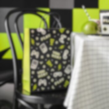 Lahjakassi, joka erottuu edukseen siistillä peliteeman designilla. Pussissa on kaksi kahvaa ja se on valmistettu paperista. Koko 10 x 32 x 24 cm.