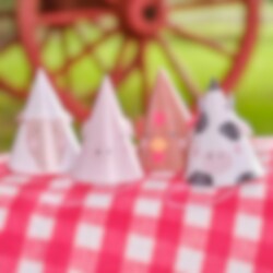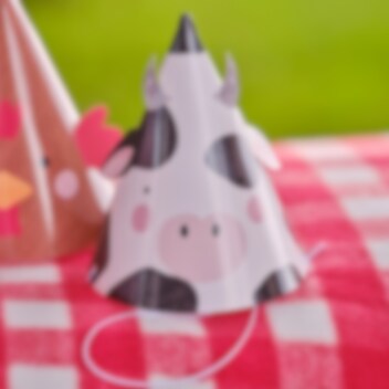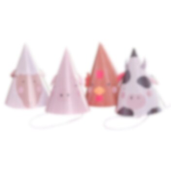 8 kpl tyylikästä juhlahattua, joissa on hauskoja lammas-, sika-, kana- ja lehmäkuvioita, jotka sopivat mainiosti maatila-aiheisiin juhliin. Hatut ovat 19 cm korkeita ja ne pysyvät paikoillaan kuminauhan avulla.