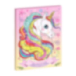 Joulukalenteri, jossa on herkullisia suklaapaloja yksisarvisteemalla. Kalenteri on noin 35 x 25 cm.