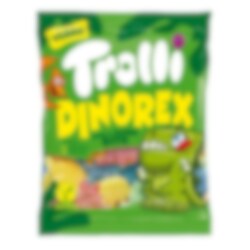 Hauskoja eri dinosaurusten muotoisia, hedelmänmakuisia hyytelökarkkeja.