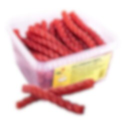 Ainesosat: Glukoosisiirappi, vehnäjauho (GLUTEENI), sokeri, vesi, inverttisokerisiirappi, aromi, suola, kosteudensäilyttäjä (sorbitoli), happo (sitruunahappo), säilöntäaine (E202), väriaine (E120), pintakäsittelyaine (kookosöljy, E903).