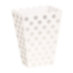 8 valkoista snäcks-laatikkoa hopeanvärisillä täplillä. Laatikot voi täyttää esimerkiksi pähkinöillä, popcornilla tai karkeilla ja ne sopivat mainiosti syntymäpäiväjuhliin tai vaikkapa leffailtaan. Laatikot on tehty pahvista ja ne ovat noin 11 x 14 cm kokoisia.