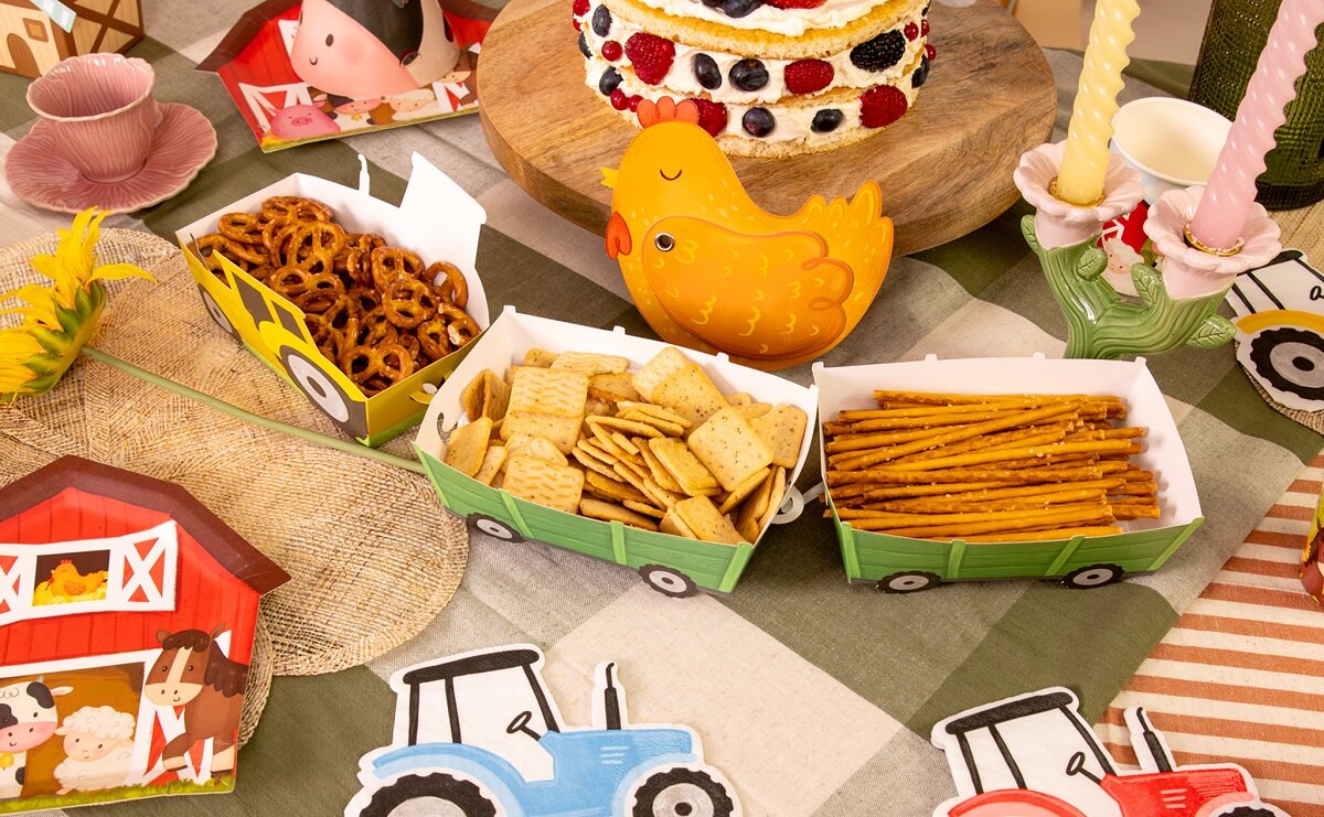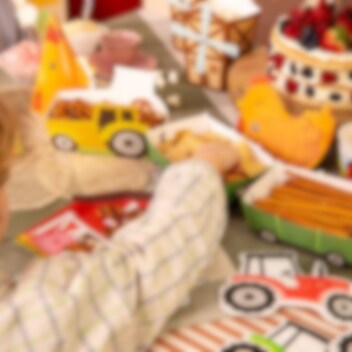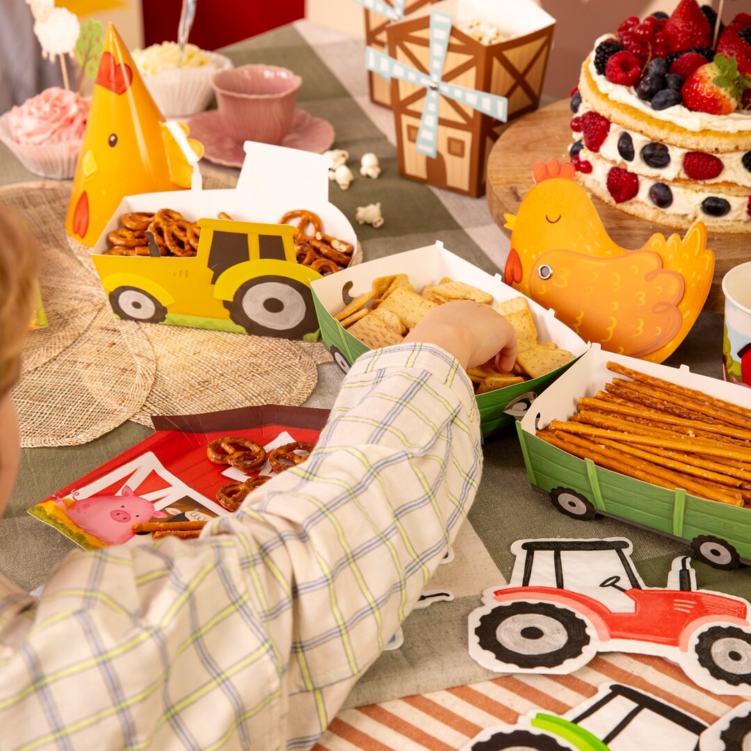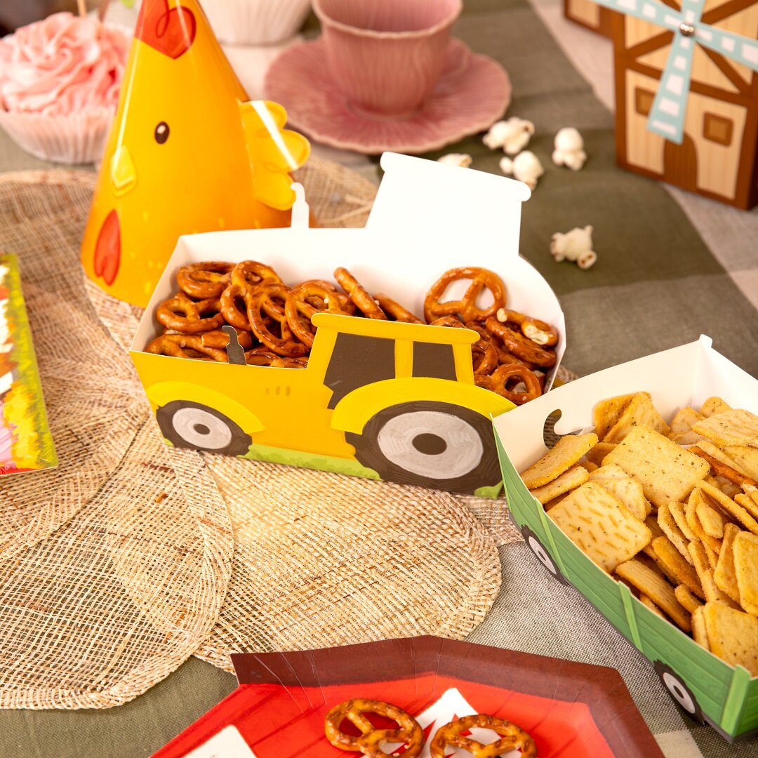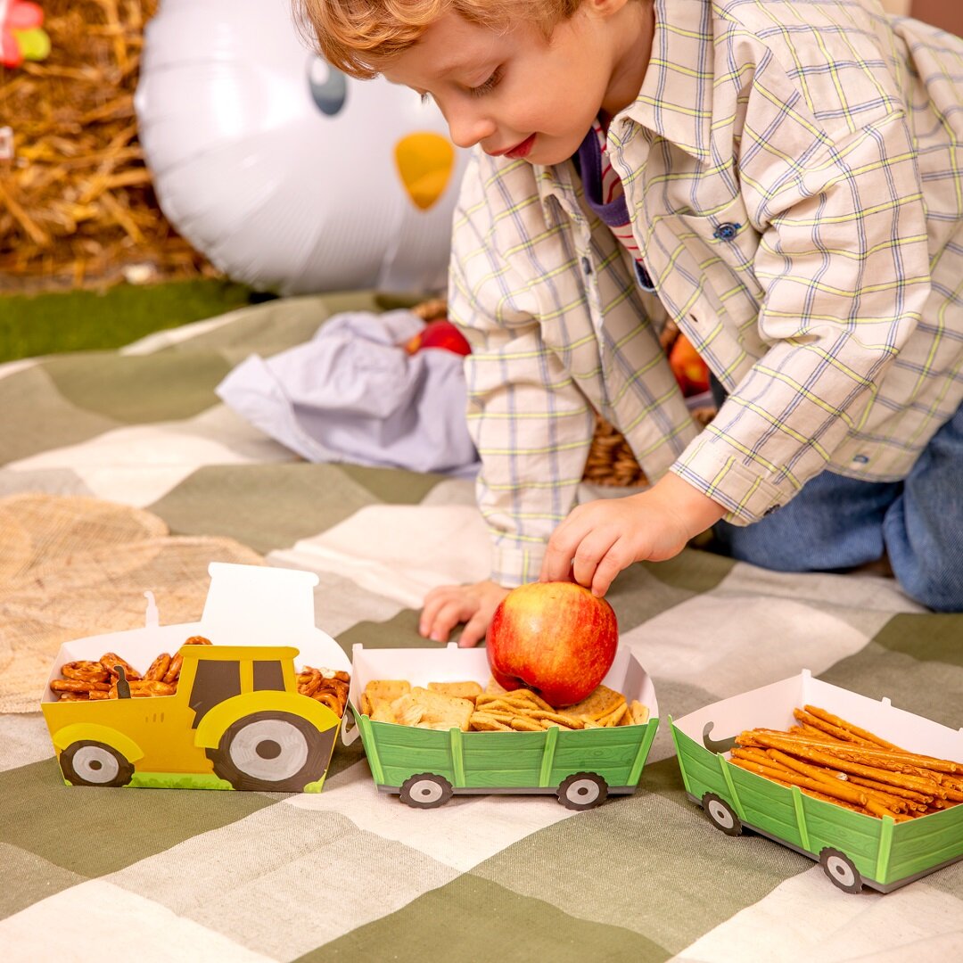 3 kpl traktorien ja niihin kuuluvien vaunujen muotoisia herkkurasioita, jotka ovat leikkisiä ja katseenvangitsevia yksityiskohtia synttärijuhlien pöydässä. Ne sopivat täydellisesti maatila-aiheisiin lasten synttärijuhliin ja tekevät tarjoilusta erityisen hauskaa pienille vieraille.