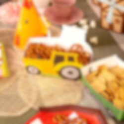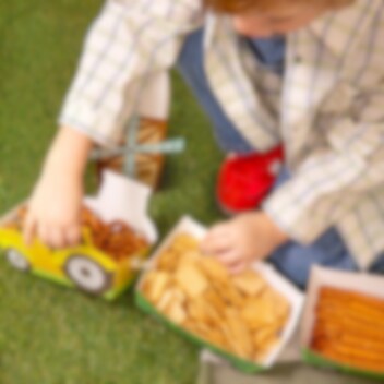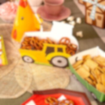 Täytä rasiat sipseillä, popcorneilla, karkeilla tai muilla herkuilla ja anna niiden olla koristeellinen osa kattausta. Rasiat on valmistettu paperista. Traktorin mitat ovat 16 x 10 x 4,5 cm.