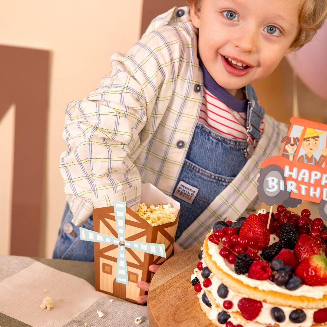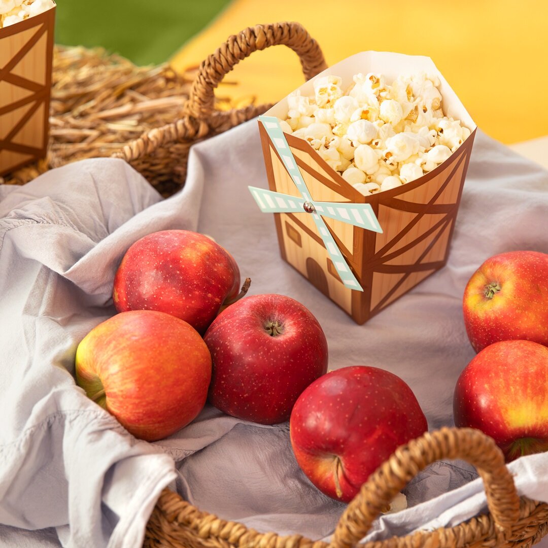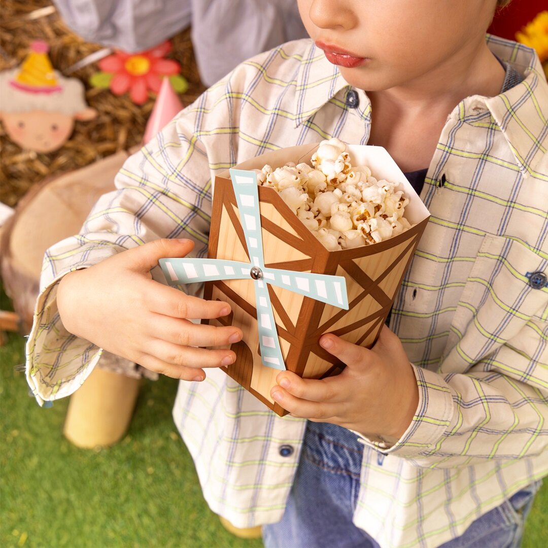 6 kpl maatila-aiheisia popcornrasioita, jotka ovat leikkisiä ja koristeellisia yksityiskohtia synttäripöydässä. Rasiat ovat muotoiltuja pieniksi myllyiksi ja sopivat täydellisesti maatila-aiheisiin lasten synttärijuhliin, ja tekevät tarjoilusta samalla erityisen hauskaa.