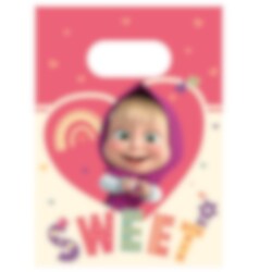 4 kpl juhlapusseja paperista. Niissä on suloinen kuva Mashasta suuren sydämen edessä. Koristeltu pienillä sydämillä, sateenkaarilla ja värikkäillä yksityiskohdilla. Täydellisiä täytettäväksi karkeilla, pienillä leluilla tai hauskoilla yllätyksillä, jotka lapset voivat ottaa mukaansa kotiin juhlien jälkeen.