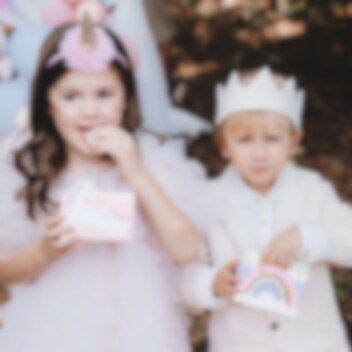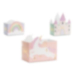 6 kpl pastellivärisiä herkkurasioita kauniilla yksisarvisten, linnojen ja sateenkaarien kuvioilla. Täytä nämä rasiat herkuilla tai makeisilla yksisarvisteemaisissa lastenjuhlissa. Rasiat on valmistettu pahvista ja ovat kooltaan 12 x 7,5 cm.