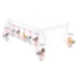 Kaunis vaaleanpunainen muovinen pöytäliina, jossa on hevos- ja kukkakuvioita. Erinomainen täydentämään juhlapöytää.