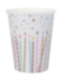 10 kpl pahvimukeja juhlavalla kuvioinnilla, jossa on värikkäitä kakkukynttilöitä, tähtiä sekä ruusukultaisia yksityiskohtia, jotka tekevät mukeista ylellisiä. Mukit ovat täydellisiä erityisen juhlaviin lastenjuhliin.