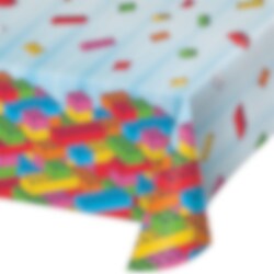 Suuri ja värikäs pöytäliina rakennuspalikoiden kuvilla. Liina toimii sekä koristeena että pöydän suojana. Liinan koko on n. 137 x 259 cm.