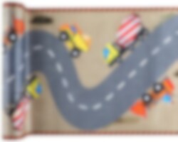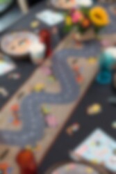 Värikäs pöytäliina, joissa on työkoneiden kuvioita tien ympärillä sekä paljon pieniä yksityiskohtia. Täydellinen lapsen ajoneuvoteemaisten syntymäpäiväjuhlien pöydän kattaukseen.